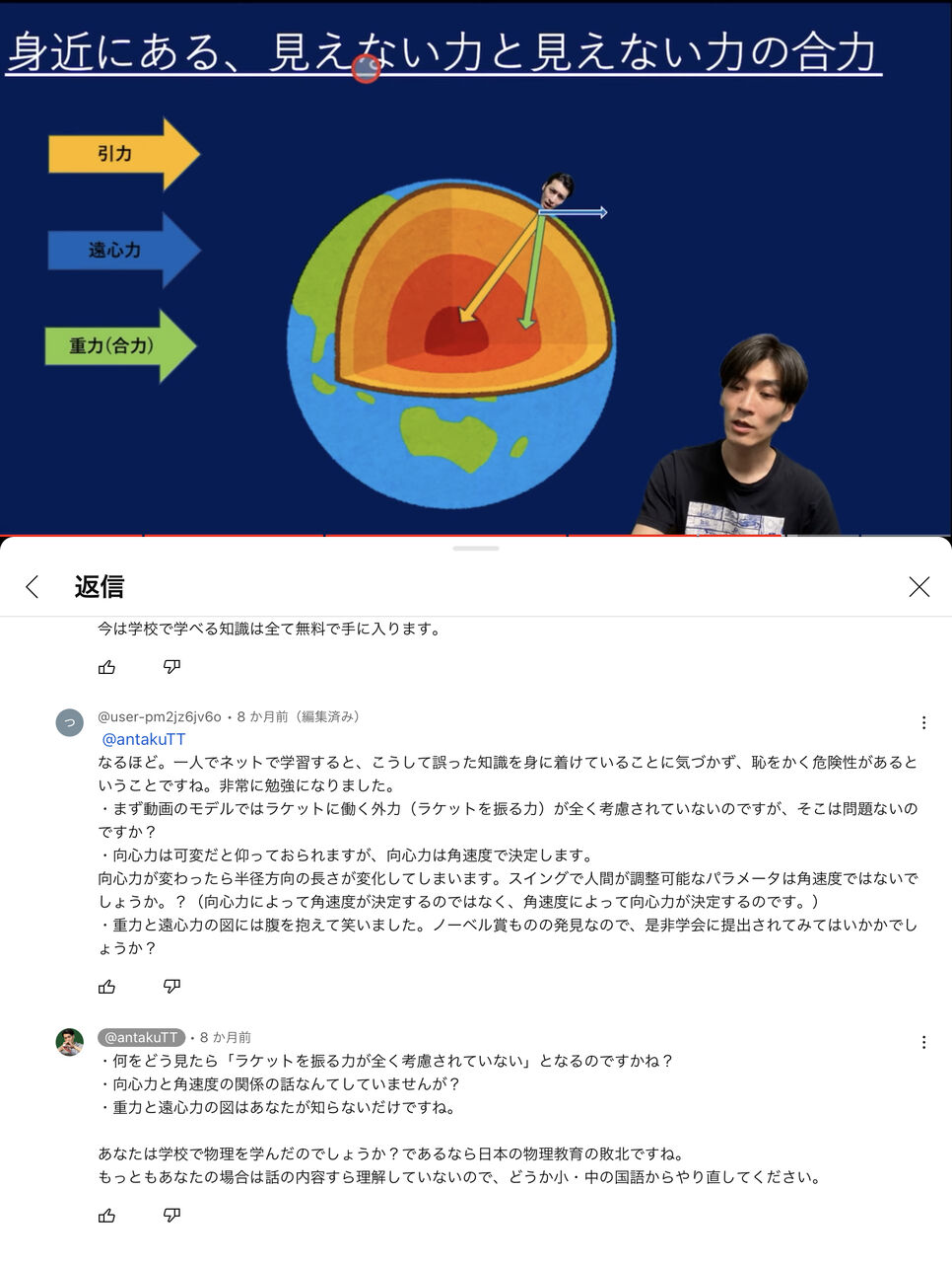・ラケットに働く向心力の反作用として「ラケットを持つ手に反作用遠心力が働く」と、アン卓さんが自分で解説しているとおり、反作用遠心力は手に働く力であり、ラケットには働きません。すでに結論が出ている明白な話なのに、アン卓さんは「人が壁を押す」例え話を出して「この図は実は人が壁を引いているのかもしれず矛盾している」「作用点は接点なので、押す、引く、作用、反作用は勝手な人間の価値観にすぎない」と力説しています。矛盾しているのはアン卓さんが壁を押す例を出しておいて勝手に「引いているかもしれない」と言って矛盾を作ったためですし、作用点は接点に面した異なる2物体の表面ですし、押す、引く、作用、反作用は人間の価値観によらない事実です。